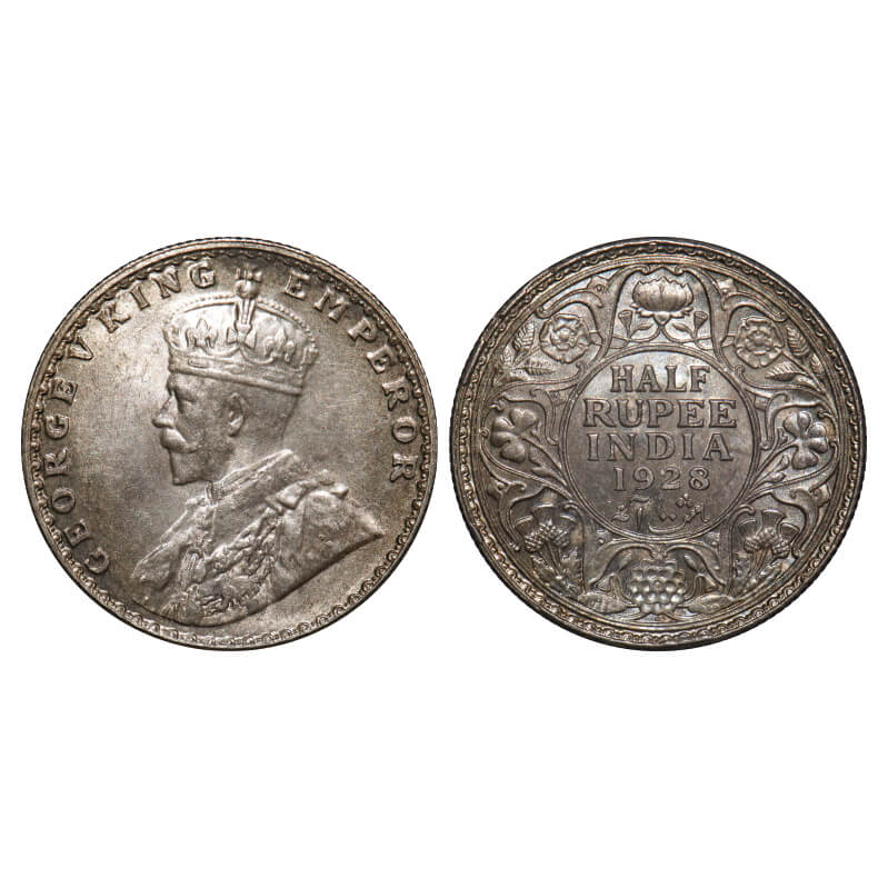 George V, Silver, Half Rupee, 1928, Bombay Mint, Dot. F. Prid 349. GK 1070. Uncirculated, Toned. Very Scarce.