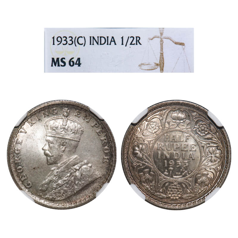 George V, Silver, Half Rupee, 1933, Calcutta Mint, No dot. F. Prid 333. GK 1073. NGC Slabbed MS 64. Rare.