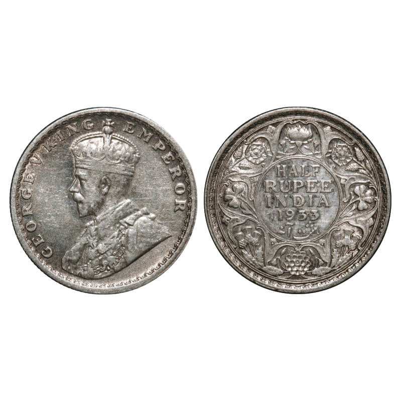 George V, Silver, Half Rupee, 1933, Calcutta Mint, No dot. F. Prid 333. GK 1073. Very Fine+. Scarce.