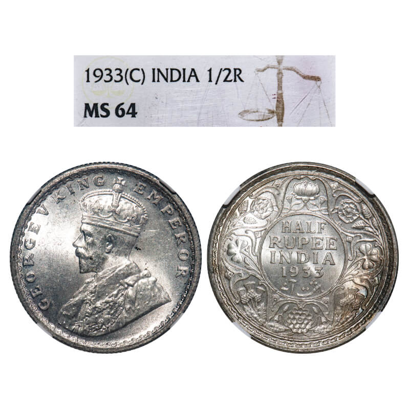 George V, Silver, Half Rupee, 1933, Calcutta Mint, No dot. F. Prid 333. GK 1073. NGC Slabbed MS 64. Rare.