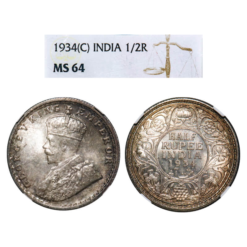George V, Silver, Half Rupee, 1934, Calcutta Mint, No dot. F. Prid 334. GK 1074. NGC Slabbed MS 64. Extremely Rare.