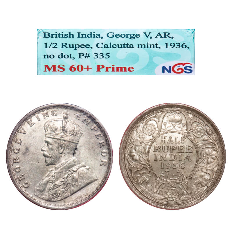 George V, Silver, Half Rupee, 1936, Calcutta Mint, No dot. F. Prid 335. GK 1075. NGS Slabbed MS 60+ Prime. Very Scarce.