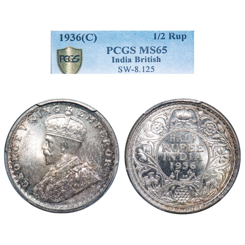 George V, Silver, Half Rupee, 1936, Calcutta Mint, No dot. F. Prid 335. GK 1075. PCGS Slabbed MS 65. Extremely Rare.