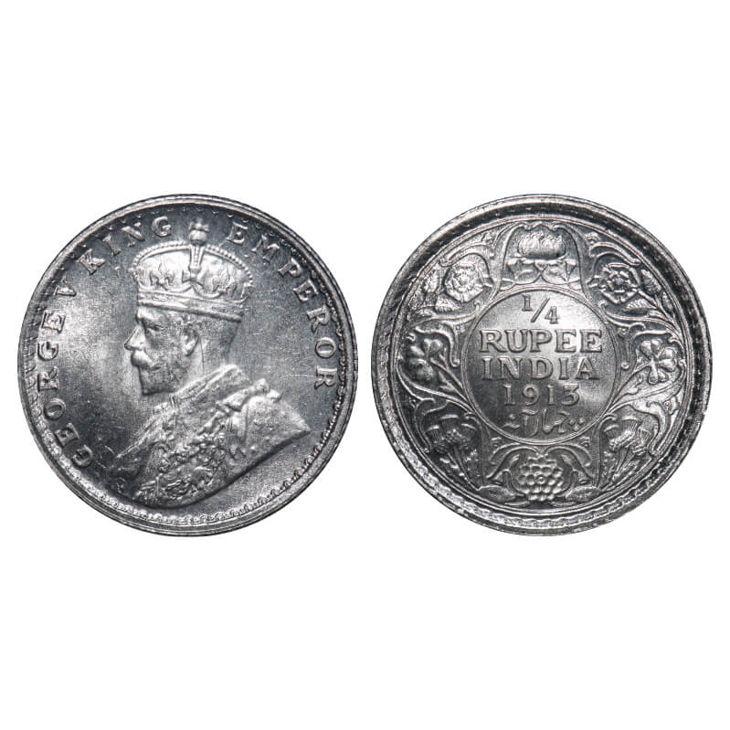 George V, Silver, 1/4 Rupee, 1913, Calcutta Mint, No dot. F. Prid 442. GK 1083. Brilliant Uncirculated. Rare.