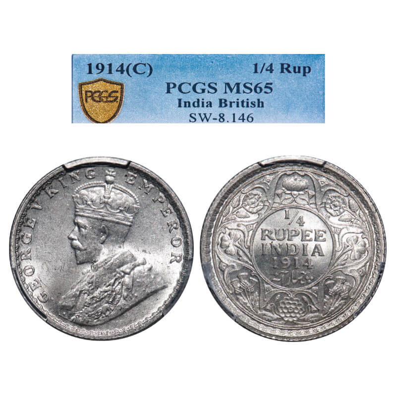 George V, Silver, 1/4 Rupee, 1914, Calcutta mint, No dot. F. Prid 443. GK 1085. PCGS Slabbed MS 65. Extremely Rare.