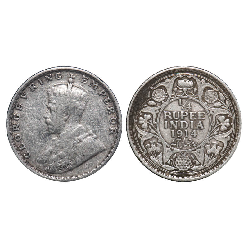 George V, Silver, 1/4 Rupee, 1914, Bombay Mint, Dot. F. Prid 456. GK 1086. Very Fine. Scarce.