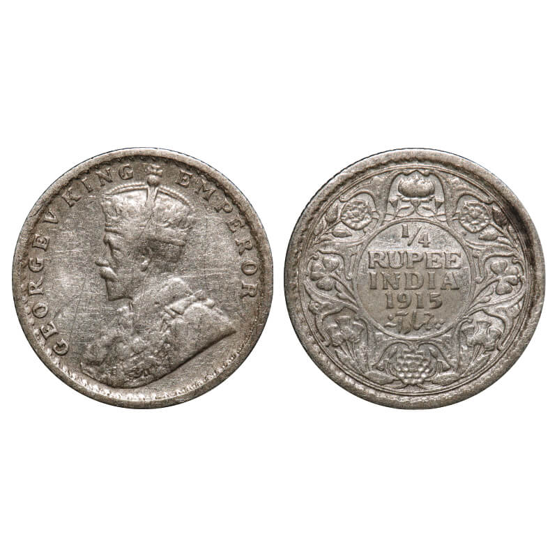 George V, Silver, 1/4 Rupee, 1915, Calcutta Mint, No dot. F. Prid 444. GK 1087. Very Fine. Very Scarce.