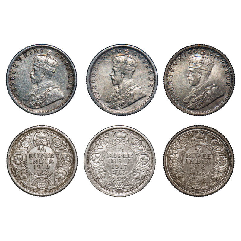 | George V, Silver, 1/4 Rupee, (3 coins), 1916, 1917, 1918, Calcutta Mint, No dot. F. Prid 445, 446, 447. GK 1089, 1090, 1091. Extremely Fine to About Uncirculated. Scarce. |