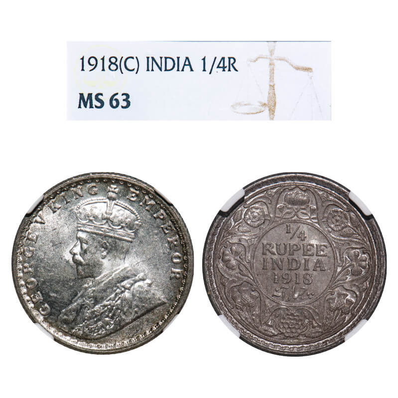 George V, Silver, 1/4 Rupee, (2 coins), 1) 1919, Calcutta Mint, No dot, 2) 1925, Bombay Mint, Dot, ...