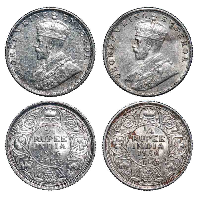 George V, Silver, 1/4 Rupee, (2 coins), 1936, Bombay Mint, Dot. F. Prid 460(2). GK 1100(2).Extremely Fine to Almost Uncirculated. Scarce.