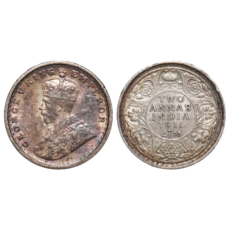 George V, Silver, 2 Annas, 1911, Calcutta Mint, No dot, Pig-Type. F. Prid 564. GK 1107. Extremely Fine+, Toned Obv. Rare.