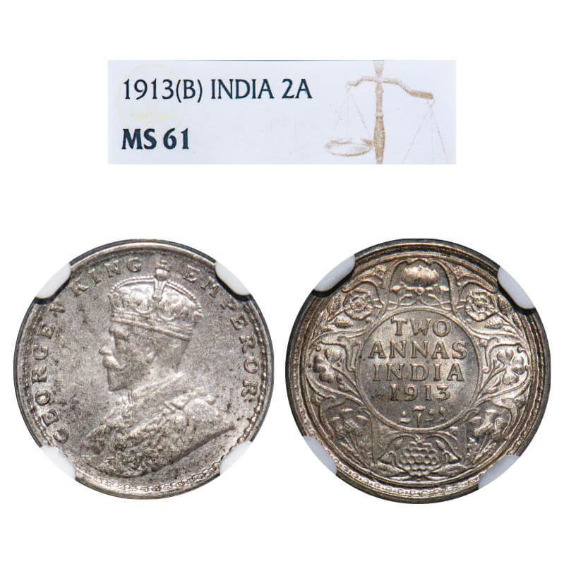 George V, Silver, 2 Annas, (2 slabs), 1) 1913, Bombay Mint, Dot, 2) 1917, Calcutta Mint, No dot, Di...