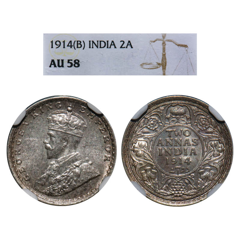 George V, Silver, 2 Annas, 1914, Bombay Mint, Dot. F. Prid 573. GK 1113. NGC Slabbed AU 58. Very Scarce.