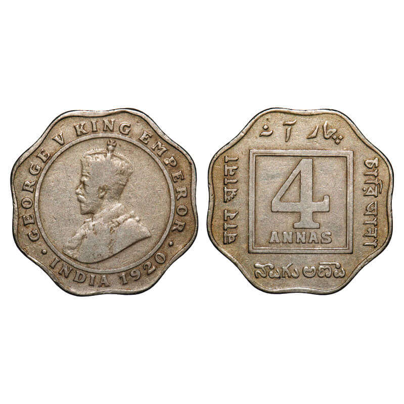 George V, Copper-Nickel, 4 Annas, 1920, Calcutta Mint, No dot. F. Prid 875. GK 1103. Very Fine+. Scarce.