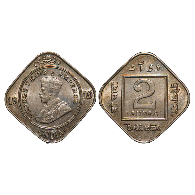 George V, Copper-Nickel, 2 Annas, 1919, Calcutta Mint, No dot. F. Prid 881. GK 1120. About Uncirculated. Very Scarce.