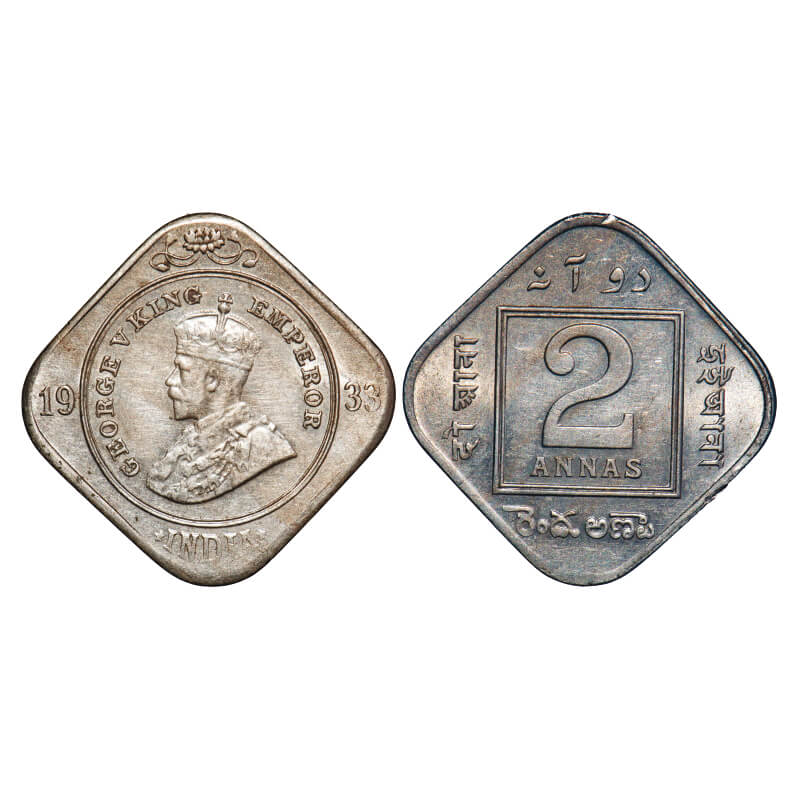 George V, Copper-Nickel, 2 Annas, 1933, Calcutta Mint, No dot. F. Prid 891. GK 1136. Uncirculated. Rare.