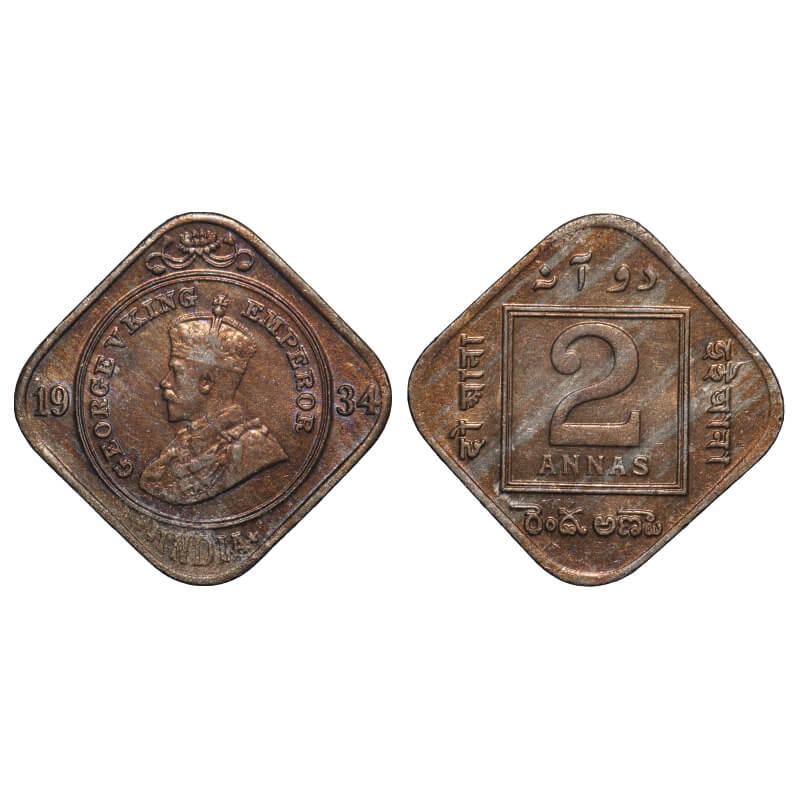 George V, Copper-Nickel, 2 Annas, 1934, Calcutta Mint, No dot. F. Prid 892. GK 1137. Extremely Fine+. Very Scarce.