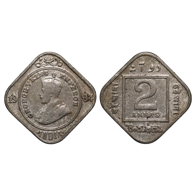 George V, Copper-Nickel, 2 Annas, 1934, Calcutta Mint, No dot. F. Prid 892. GK 1137. Fine+. Scarce.