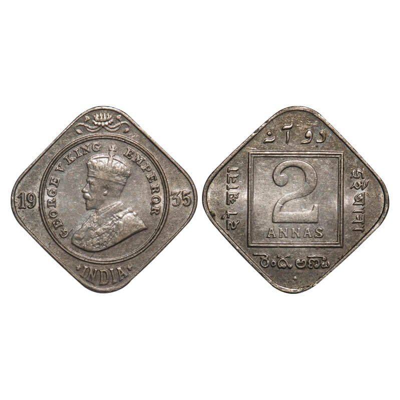 George V, Copper-Nickel, 2 Annas, 1935, Bombay Mint, Dot, Planchate flaw on Obv. F. Prid 902. GK 1139. Almost Uncirculated. Rare.