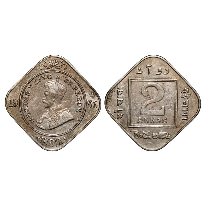 George V, Copper-Nickel, 2 Annas, 1936, Bombay Mint, Dot. F. Prid 903. GK 1140. Extremely Fine+. Scarce.