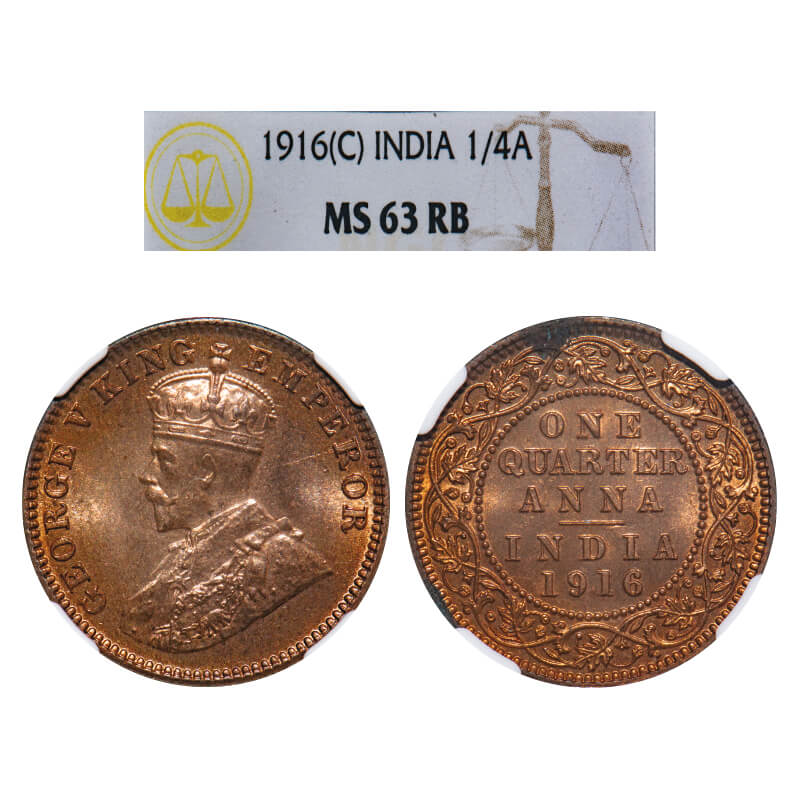 George V, Bronze, Quarter Anna, 1916, Calcutta Mint, No dot. F. Prid 661. GK 1175. NGC Slabbed MS 63 RB. Very Rare.