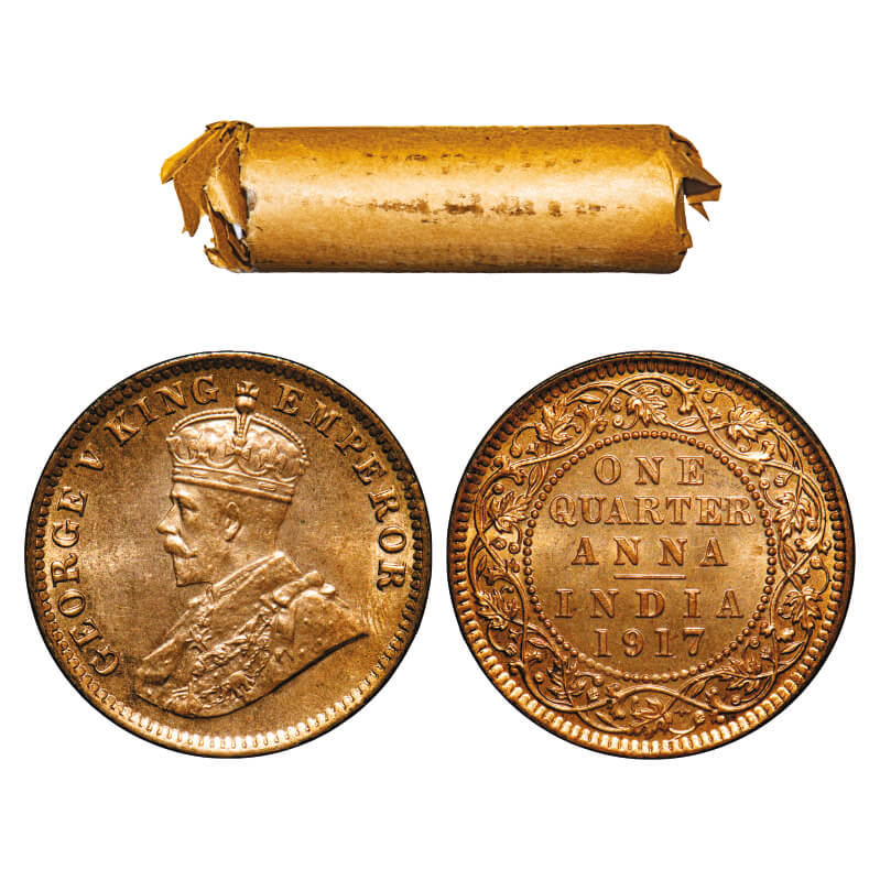 George V, Bronze, Quarter Anna, (Roll of 32 coins), 1917, Calcutta Mint, No dot, 32 coins in immaculate Grades re rolled in a Brown paper roll from old broken paper roll. F. Prid 662. GK 1176. Rare.