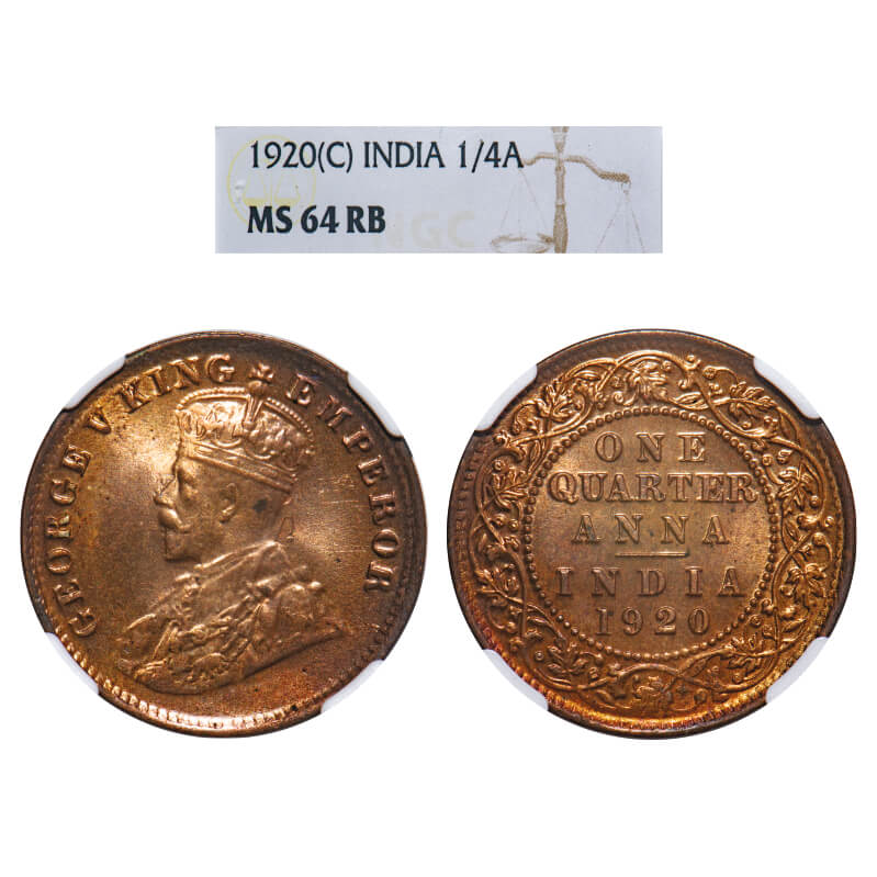 George V, Bronze, Quarter Anna, 1920, Calcutta Mint, No dot. F. Prid 665. GK 1179. NGC Slabbed MS 64 RB. Rare.