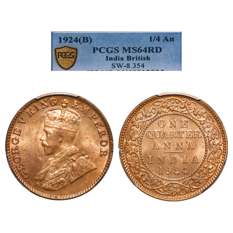 George V, Bronze, Quarter Anna, 1924, Bombay Mint, Dot. F. Prid 677. GK 1180. PCGS Slabbed MS 64 RD. Very Rare.