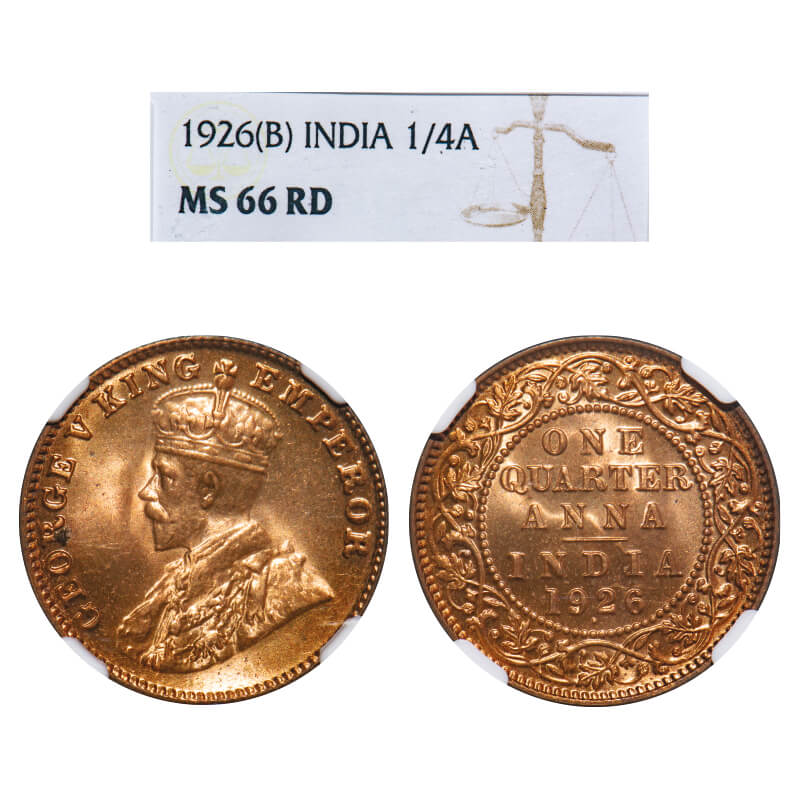 George V, Bronze, Quarter Anna, 1926, Bombay Mint, Dot. F. Prid 679. GK 1183. NGC Slabbed MS 66 RD. Extremely Rare.