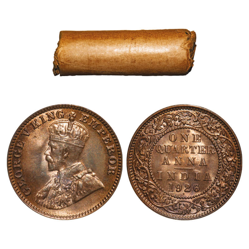 George V, Bronze, Quarter Anna, (Roll of 32 coins), 1926, Bombay Mint, Dot. 32 coins in immaculate Grades in a Brown paper roll. F. Prid 679. GK 1183. Extremely Rare.