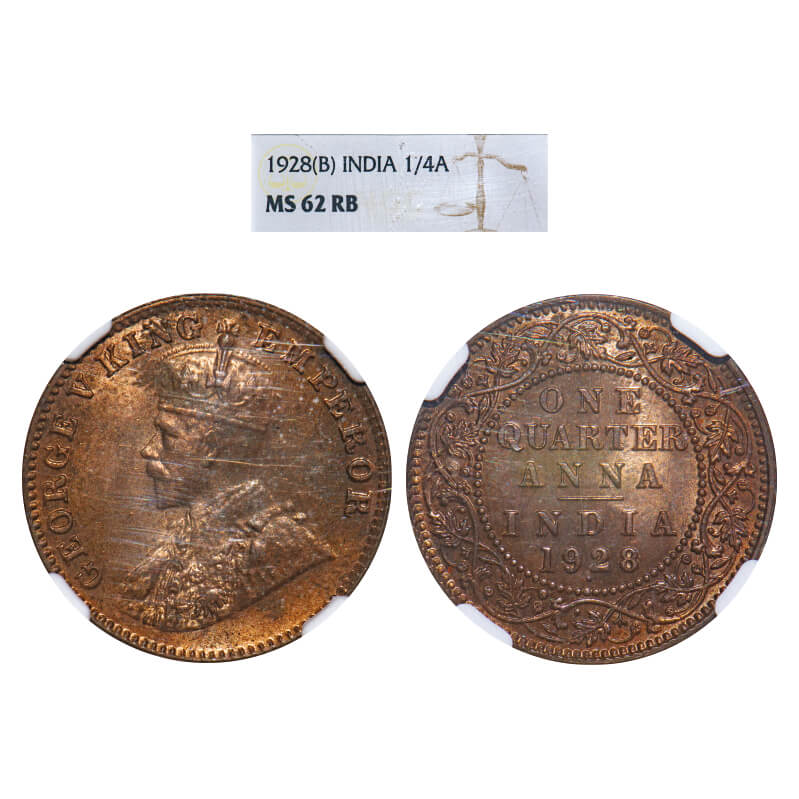 George V, Bronze, Quarter Anna, 1928, Bombay Mint, Dot. F. Prid 681. GK 1187. NGC Slabbed MS 62 RB. Scarce.