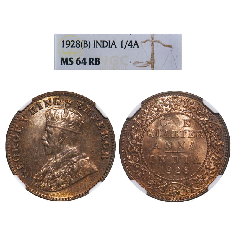 George V, Bronze, Quarter Anna, 1928, Bombay Mint, Dot. F. Prid 681. GK 1187. NGC Slabbed MS 64 RB. Very Rare.
