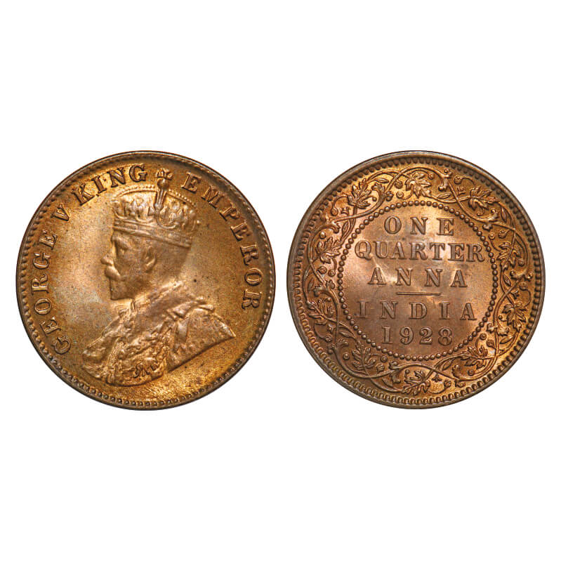 George V, Bronze, Quarter Anna, 1928, Calcutta Mint, No dot. F. Prid 669. GK 1188. Mint State. Very Scarce.