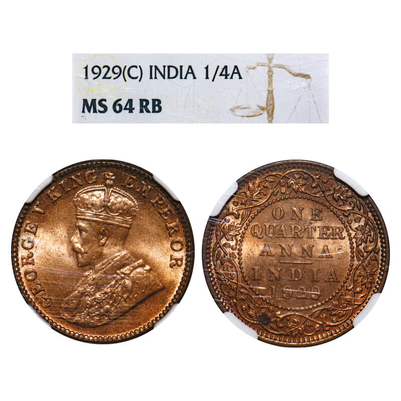 George V, Bronze, Quarter Anna, 1929, Calcutta Mint, No dot. F. Prid 670. GK 1189. NGC Slabbed MS 64 RB. Very Rare.