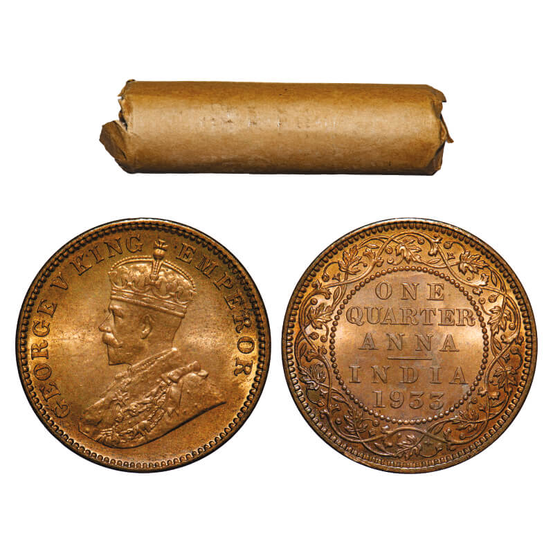 George V, Bronze, Quarter Anna, (Roll of 32 coins), 1933, Calcutta Mint, No dot, 32 coins in immaculate Grades re rolled in a Brown paper roll from old broken paper roll. F. Prid 673. GK 1193. Rare.