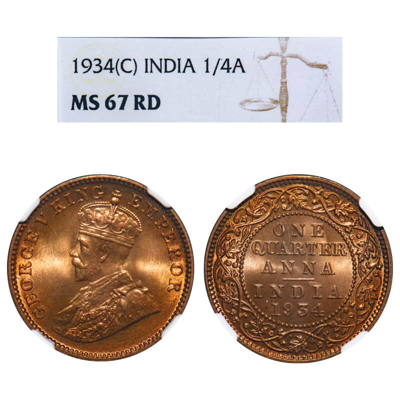 George V, Bronze, Quarter Anna, 1934, Calcutta Mint, No dot. F. Prid 674. GK 1194. NGC Slabbed MS 67 RD. Exceedingly Rare.