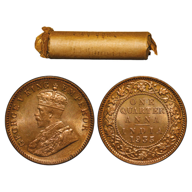 George V, Bronze, Quarter Anna, (Roll of 32 coins), 1935, Calcutta Mint, No dot, 32 coins in immaculate Grades re rolled in a Brown paper roll from old broken paper roll. F. Prid 675. GK 1195. Rare.