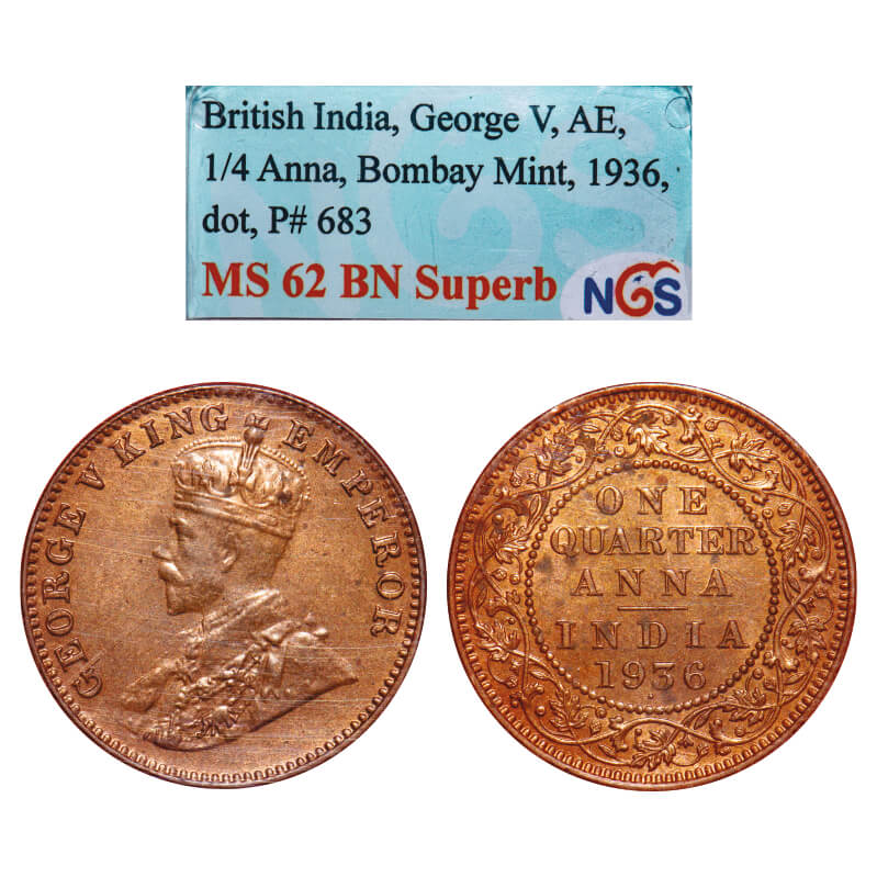 George V, Bronze, Quarter Anna, 1936, Bombay Mint, Dot. F. Prid 683. GK 1196. NGS Slabbed MS 62 BN Brilliant. Very Scarce.