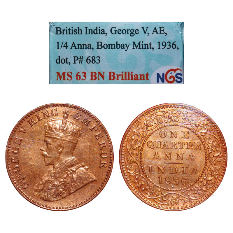 George V, Bronze, Quarter Anna, 1936, Bombay Mint, Dot. F. Prid 683. GK 1196. NGS Slabbed MS 63 BN Brilliant. Very Scarce.