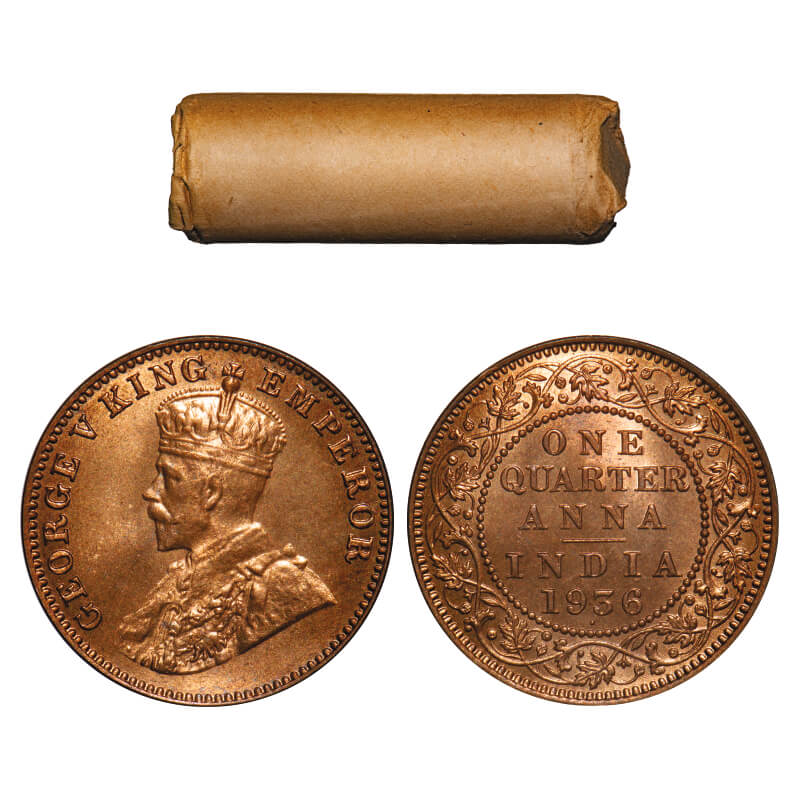 George V, Bronze, Quarter Anna, (Roll of 32 coins), 1936, Bombay Mint, Dot. 32 coins in immaculate Grades in a Brown paper roll. F. Prid 683. GK 1196. Rare.