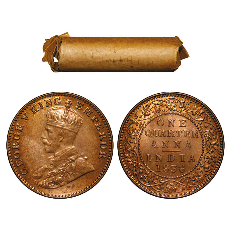 George V, Bronze, Quarter Anna, (Roll of 32 coins), 1936, Bombay Mint, Dot, 32 coins in immaculate Grades re rolled in a Brown paper roll from old broken paper roll. F. Prid 683. GK 1196. Rare.