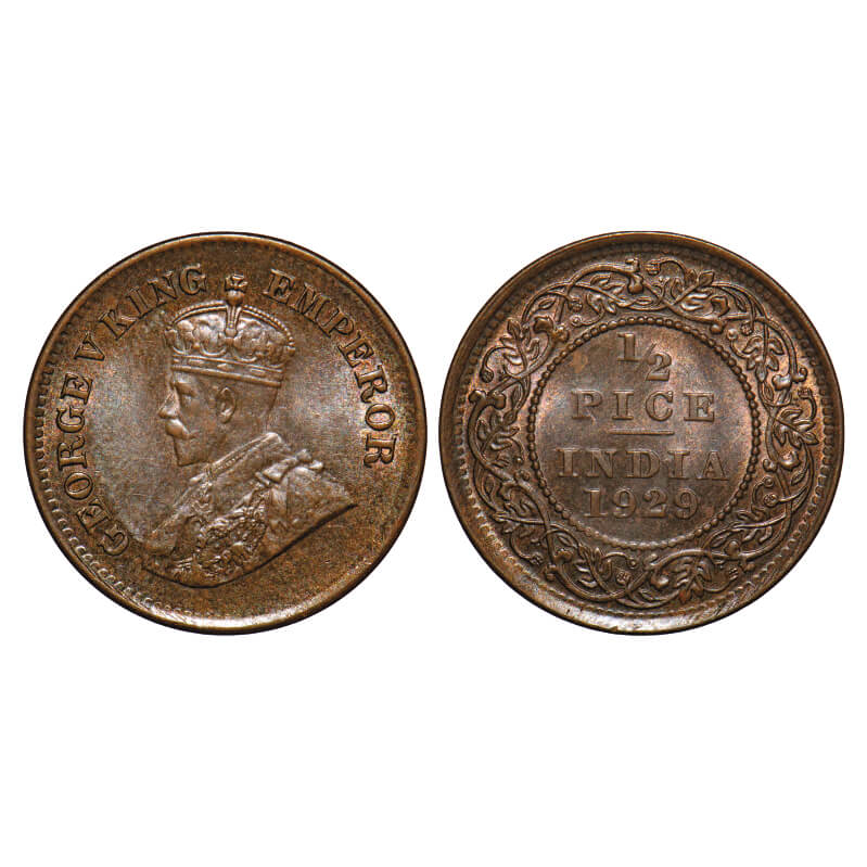 George V, Bronze, 1/2 Pice, 1929, Calcutta Mint, No mint mark, Ghost on Rev. F. Prid 762. GK 1215. Brilliant Uncirculated. Very Scarce.
