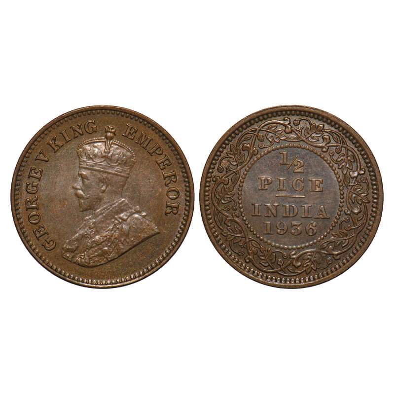 George V, Bronze, 1/2 Pice, 1936, Calcutta Mint, No mint mark. F. Prid 769. GK 1222. Uncirculated. Scarce.