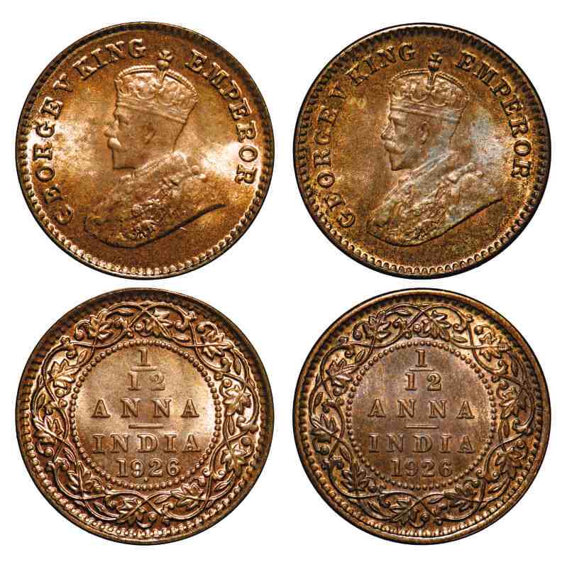 George V, Bronze, 1/12 Anna, ( 2 coins), 1926, 1) Bombay Mint, Dot, 2) Calcutta Mint, No dot. GK 1239, 1240. Brilliant Uncirculated. Rare.