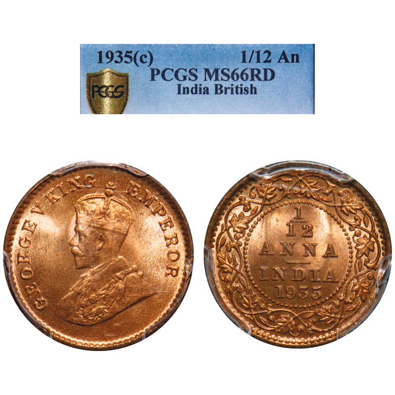 George V, Bronze, 1/12 Anna, 1935, Calcutta Mint, No dot. F. Prid 849. GK 1251. PCGS Slabbed MS 66 RD. Extremely Rare.