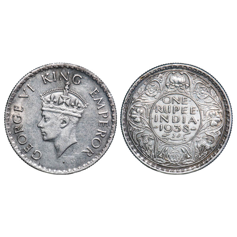 | George VI, Silver, Rupee, 1938, Bombay Mint, A/I, No dot, Milled edge, Mis aligned die on Rev. F. Prid 233. GK 1254. Very Fine, Cleaned. Scarce. |