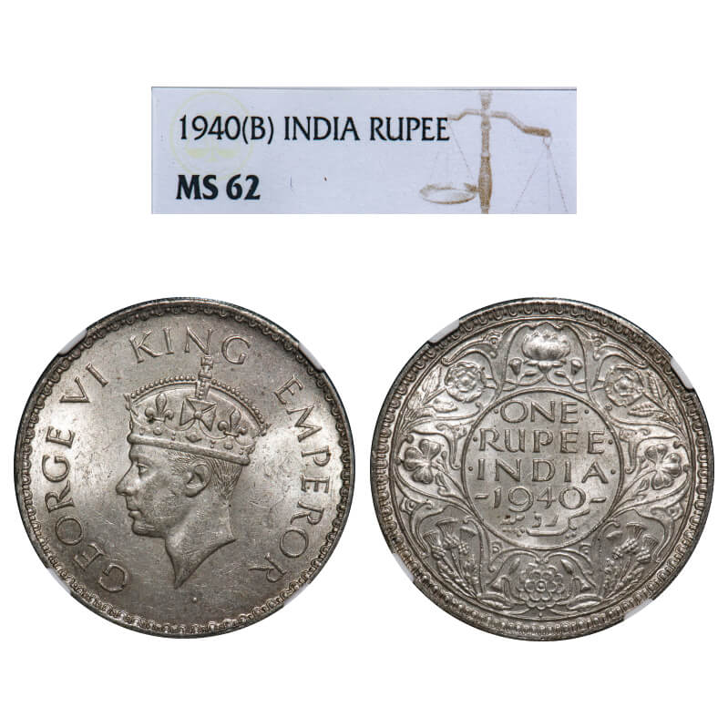 | George VI, Half Silver, Rupee, 1940, Bombay Mint, A(a)/I, Dot, Security edge, Rev boarder teeth design is shorter and bolder and dot mm is not aligned with short tooth. F. Prid 237. GK 1258. NGC Slabbed MS 62. Very Rare. |