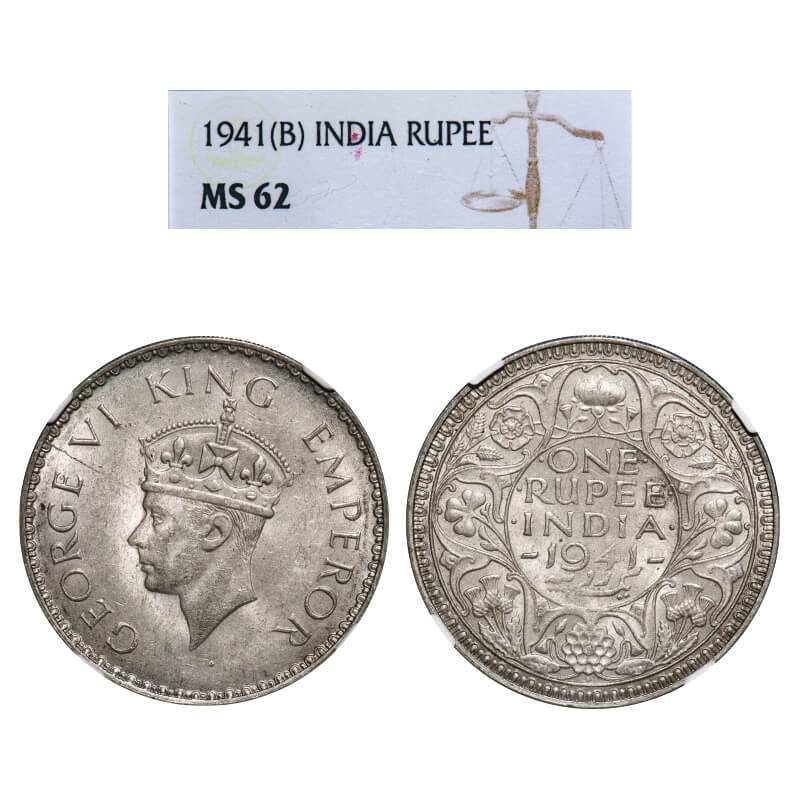 | George VI, Half Silver, Rupee, 1941, Bombay Mint, A(a)/I, Dot, Security edge, Rev boarder teeth design is long and dot mm is almost aligned with short tooth in between the Two big teeth. F. Prid 239. GK 1260. NGC Slabbed MS 62. Very Rare. |
