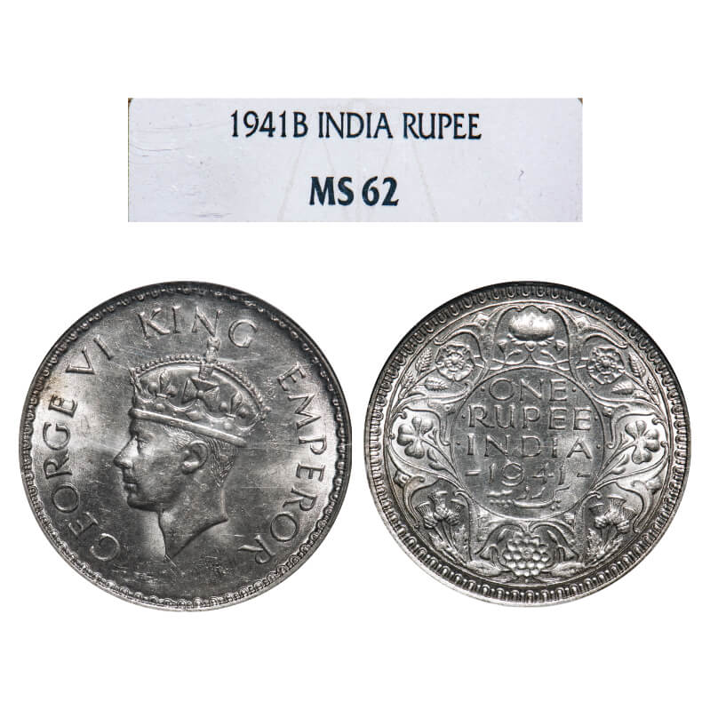 | George VI, Half Silver, Rupee, 1941, Bombay Mint, A(a)/I, Dot, Security edge, Rev border teeth design is long and dot mm is not aligned with short tooth in between the Two big teeth. F. Prid 238. GK 1261. NGC Slabbed MS 62. Rare. |