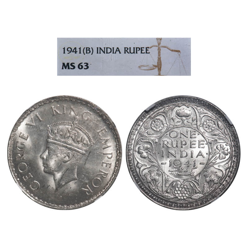 | George VI, Half Silver, Rupee, 1941, Bombay Mint, A(a)/I, Dot, Security edge, Rev border teeth design is long and dot mm is not aligned with short tooth in between the Two big teeth. F. Prid 238. GK 1261. NGC Slabbed MS 63. Very Rare. |